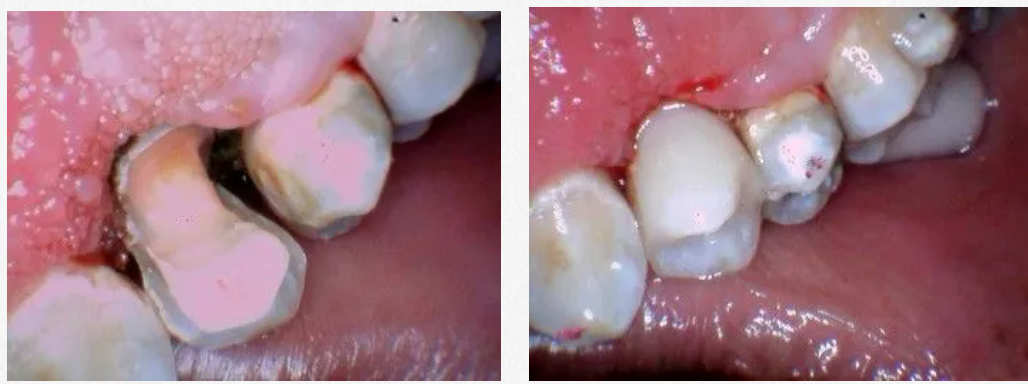 All white (porcelain) crown replacing an old silver filling/crack in the tooth.