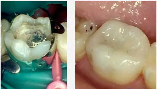 Decay under old tooth colored fillings removed, new tooth colored fillings placed (that bump is a salivary gland next to a cotton tip applicator. Red markings to check bite before starting to help design the filling).